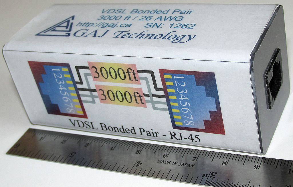 Single Pair & Bounded Pair xDSL with RJ‑45 GAJ Technology's wireline simulator reproduce the characteristics of one pair (2‑wire) or two pairs (4‑wire) of 20 AWG, 24 AWG or 26 AWG cable. The RJ‑45 jacks at each ends can be used with either RJ‑11 or RJ‑45 plugs. The 2 or 4 wires simulator are connected as shown in the figure at the left. GAJ Technology's wireline simulators supports any communication protocol, such as the VDSL Standard ITU G.993.1, which offers speeds of up to 52 Mbit/s downstream and 16 Mbit/s upstream, over a single flat untwisted or twisted pair of copper wires using the frequency band from 25 kHz to 12 MHz. The wireline simulator complies with ETSI/STC TM6(97)02, 970p02r3 cable reference models for simulating metallic access networks.