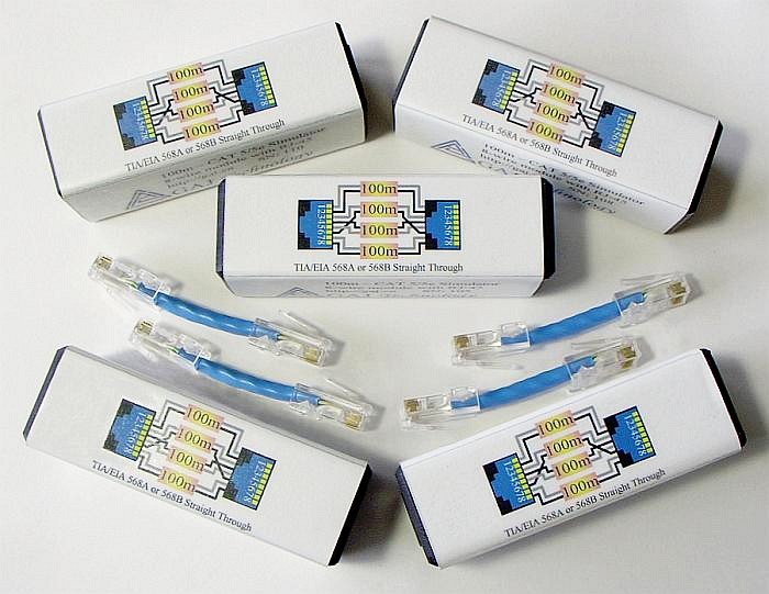 Our small "match box sized" simulators can be quickly daisy chained to simulate incremental lengths of CATx twisted pair cable.